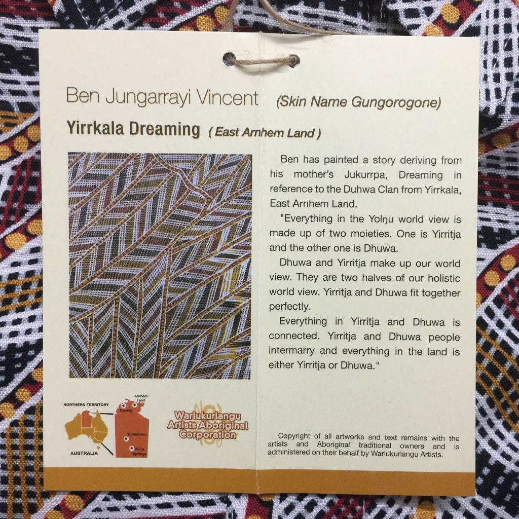 Ben has painted a story deriving from his mother’s Jukurrpa Dreaming in reference to the Duhwa Clan from Yirrkala, East Arnhem Land. Everything in the Yolnu world view is made up of two moieties. One is Yirritja and the other one is Dhuwa. Dhuwa and Yirritja make up our world view. They are two parts of our holistic world view. Yirritja and Dhuwa fit together perfectly. Everything in Yirritja and Dhuwa is connected. Yirritja and Dhuwa people intermarry and everything in the land is either Yirritja or Dhuwa.